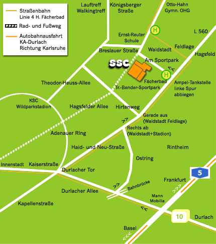 Auf der Haid-und-Neu-Strasse immer gerade aus (stadtauswärts) bis Kreuzung "Am Sportpark" -dort (auf Höhe der Tankstelle) links abbiegen